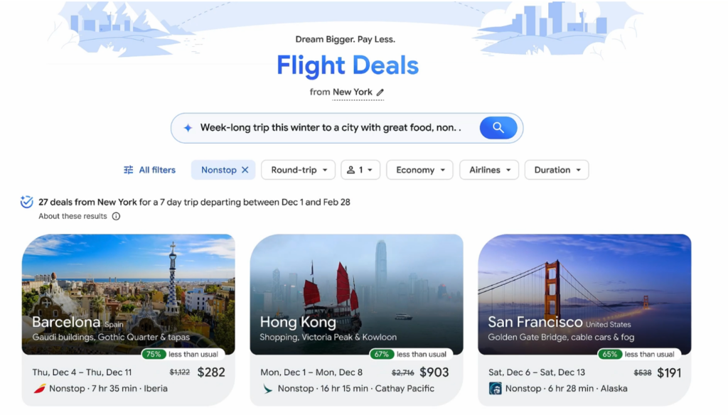 특히 핵심적인 장점은 구글의 고급 AI 기술을 활용하여 사용자가 찾고 있는 내용의 미묘한 뉘앙스까지 정교하게 이해하고, 이에 맞는 목적지를 식별한다는 점입니다. 이어서 실시간 구글 플라이트 데이터를 활용하여 수백 개의 항공사와 예약 사이트에서 가장 관련성 높고 최신 정보를 담은 옵션들을 신속하게 제공하는 기능을 갖추고 있습니다. 또한 이렇게 검색을 하는 과정에서 사용자 스스로 미처 고려하지 못했던 매력적인 목적지들이 제안될 수도 있습니다.