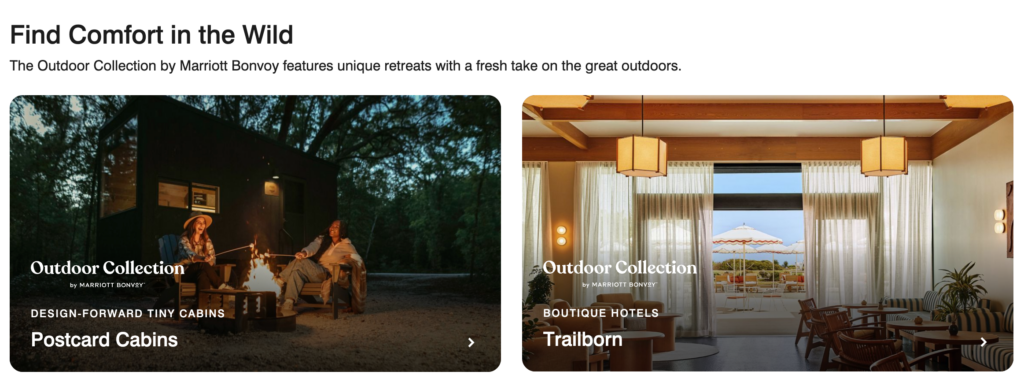 메리어트는 9,500개가 넘는 전 세계 호텔 중에서 진정으로 ‘아웃도어 중심’이라고 부를 수 있는 곳을 엄격하게 선별해 ‘아웃도어 컬렉션’을 별도로 선보였습니다. 이 컬렉션의 초기 멤버로는 포스트카드 캐빈스와 트레일본이 포함되었습니다.
