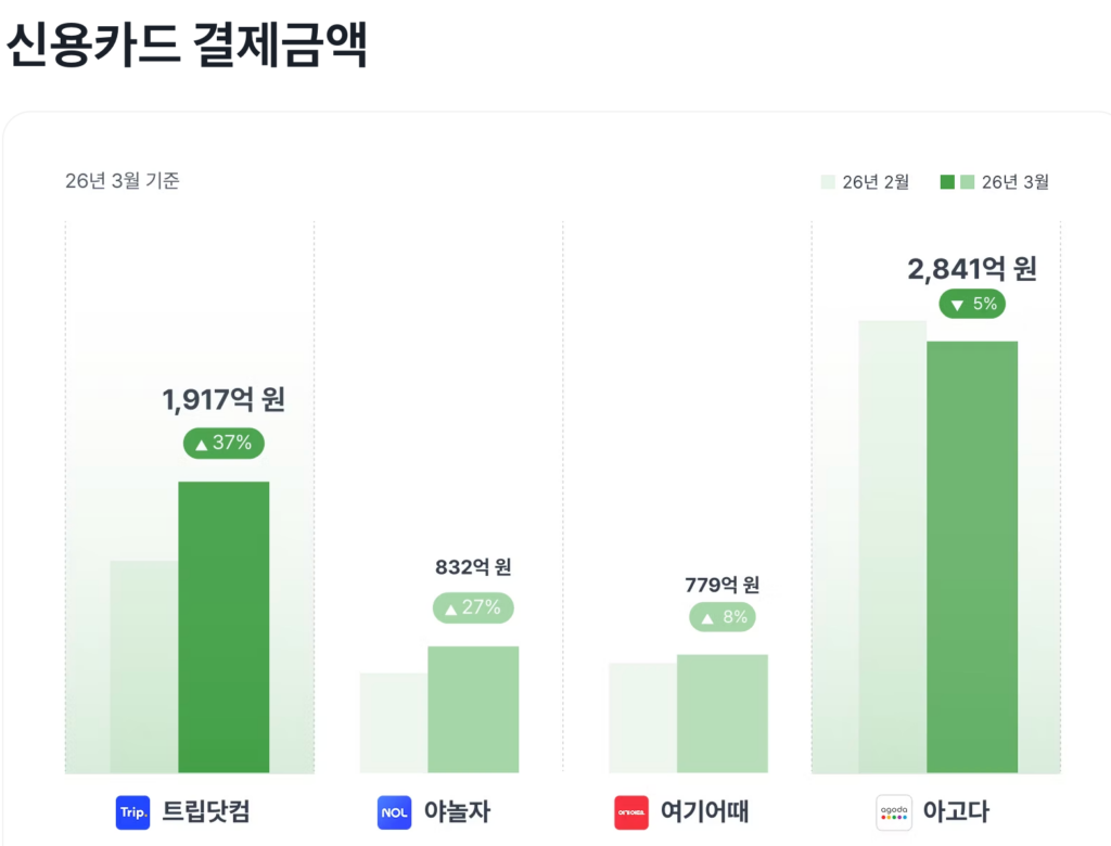하지만 신용카드 결제 금액을 대조하면 양상은 반전됩니다. 아고다의 3월 결제액은 2,841억 원으로 야놀자(832억 원)보다 무려 3.4배 높았으며, 트립닷컴 또한 전월 대비 무려 37%나 폭증한 1,917억 원을 기록했습니다. 이는 국내 플랫폼 유저들이 저단가 국내 숙박에 집중된 반면, 실질적인 매출을 견인하는 고단가 해외여행 결제는 글로벌 플랫폼으로 쏠리고 있음을 입증합니다.