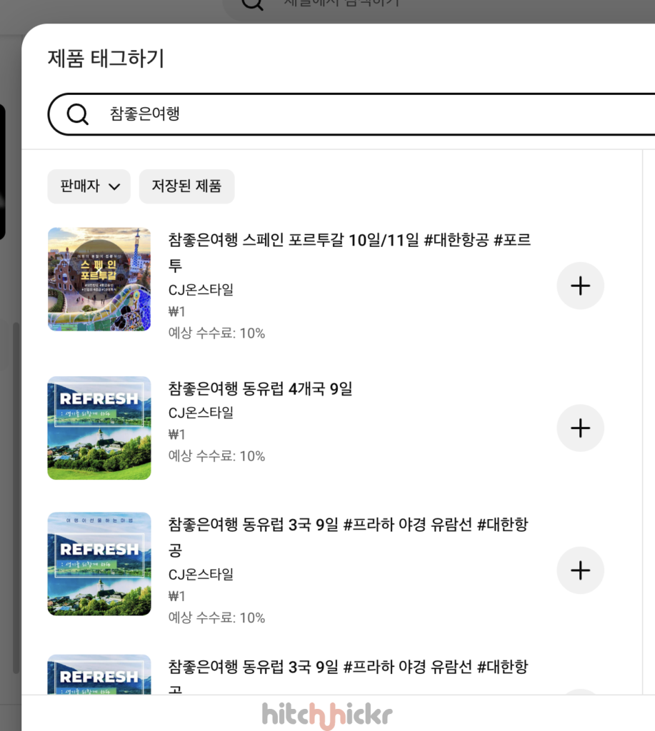 그런데 이 과정에서 흥미로운 현상이 포착됐다. 홈쇼핑 업체가 보유한 방대한 상품 카테고리 중 일부 여행 패키지 상품들이 유튜브 쇼핑의 제휴 상품으로 검색되기 시작한 것이다. 이는 여행사가 직접 움직이기 전, 대형 유통 플랫폼이 구축한 시스템을 타고 여행 상품이 유튜브 쇼핑 생태계에 조심스럽게 발을 들여놓았음을 의미한다. 그래서 ‘히치하이커TV’에서도 검색 가능한 패키지 상품을 기 업로드된 콘텐츠와 연결해서 시청자들에게 추천하고 있다.