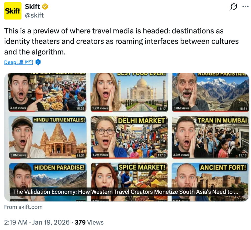 스키프트(Skift)의 창립자 라파엘 알리(Rafat Ali)는 2026년 1월 18일 칼럼으로 통해 인도, 파키스탄 등 거대한 인구와 높은 영어 구사력을 가진 국가들을 중심으로 서구 유튜버의 찬사를 통해 자국의 가치를 확인받으려는 ‘인정 경제(Validation Economy)’가 강력한 상업 모델로 부상했다고 지적했다.